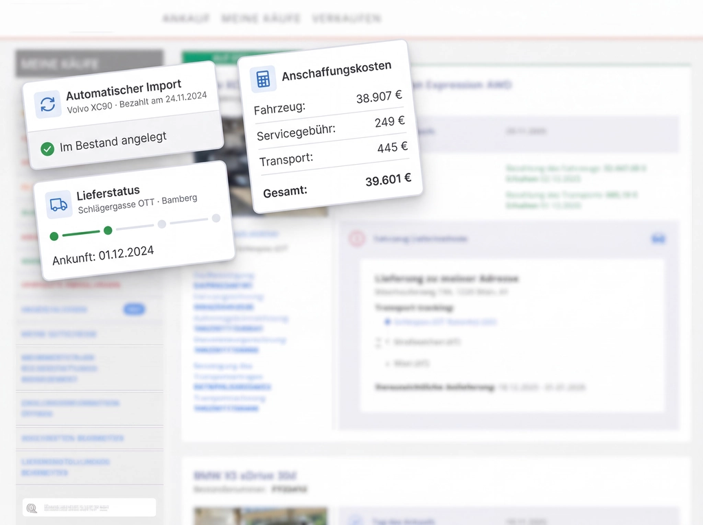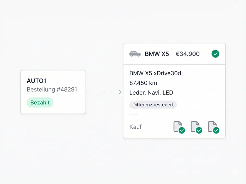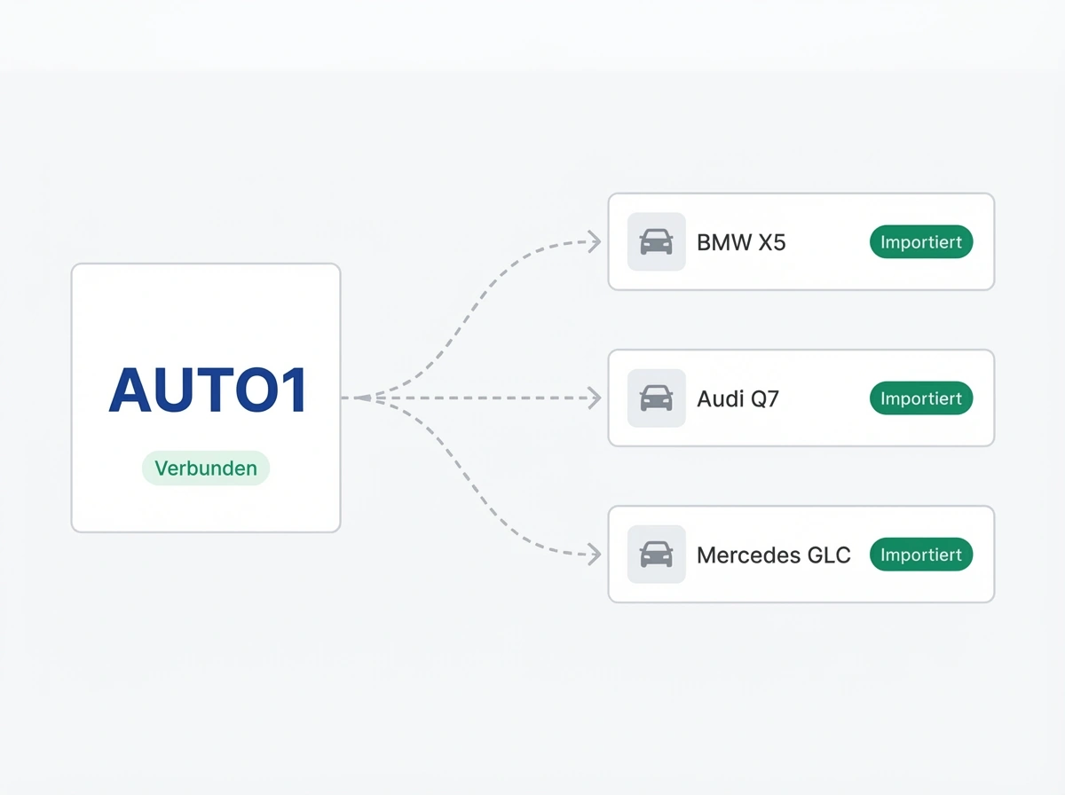 AUTO1-Konto einmal verbinden. Danach erscheint jede bezahlte Bestellung mit gebuchter Logistik automatisch in Ihrem Bestand. Keine Sync-Buttons. Keine geplanten Importe. Fahrzeuge erscheinen einfach.