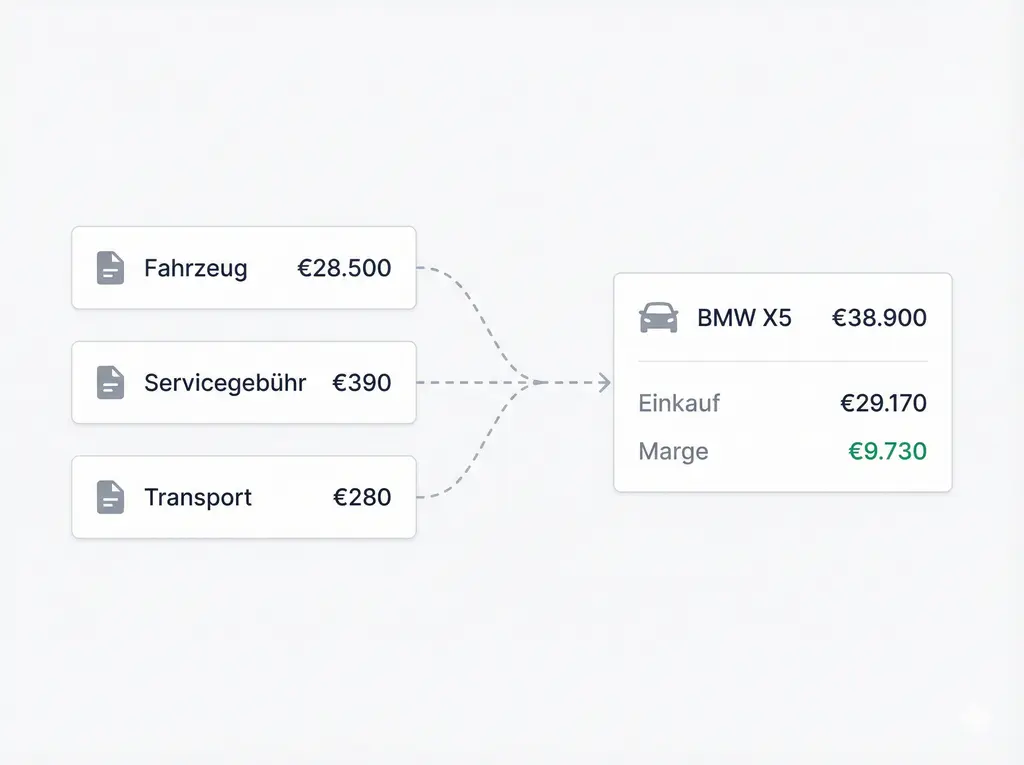 Ein AUTO1-Kauf umfasst Fahrzeugpreis, Auktionsgebühren, Servicegebühren und Transport. Autoblicker summiert alle Rechnungen, damit Ihre Margen das widerspiegeln, was Sie wirklich bezahlt haben.