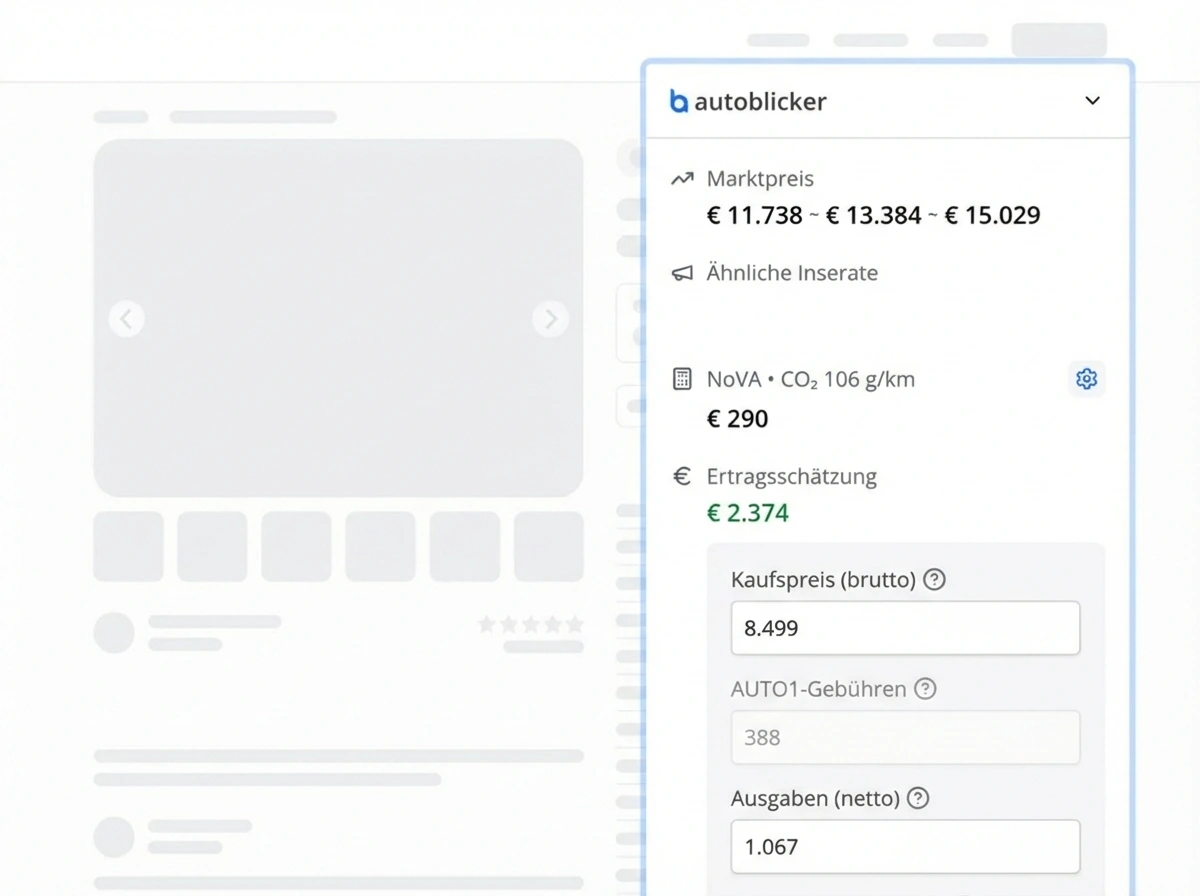 Unsere Browser-Erweiterung zeigt Marktpreise, NoVA-Berechnungen und Margenschätzungen direkt auf AUTO1-Inseraten. Entscheidungen während der Auktion treffen, nicht Entdeckungen danach.