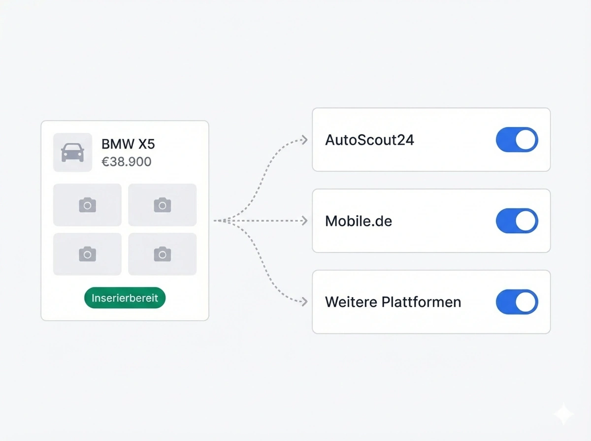 Daten und Kaufinformationen sind vorhanden. Laden Sie Ihre Fotos hoch, legen Sie Ihren Preis fest, aktivieren Sie Plattformen und Sie sind live auf AutoScout24, Mobile.de und weiteren Plattformen.