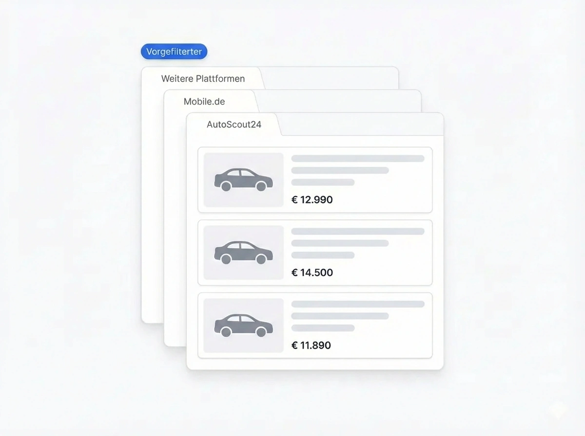 Links zu AutoScout24, Mobile.de und anderen Plattformen sind bereits für vergleichbare Fahrzeuge gefiltert. Preise, Verfügbarkeit und Standzeit sehen, ohne selbst Suchen aufbauen zu müssen.