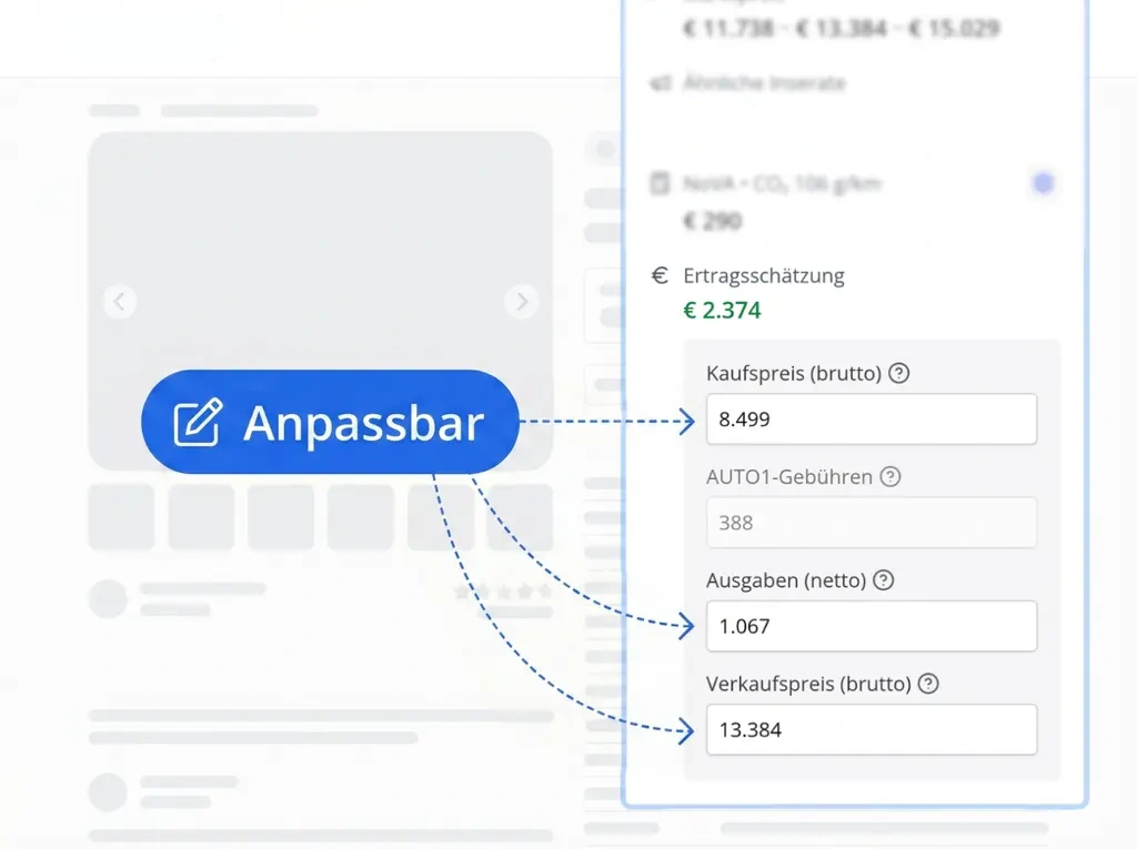Wenn Sie auf AUTO1.com browsen, sehen Sie Marktpreise, NoVA-Berechnungen und Margenschätzungen direkt beim Inserat. Szenarien sofort testen. Informierte Entscheidungen während der Auktion treffen, nicht Überraschungen nach dem Zuschlag.