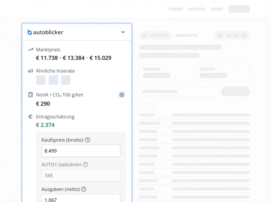 Die Erweiterung nutzt dieselben Marktpreis- und NoVA-Berechnungen wie das Autoblicker-Bestandssystem. Konsistente Daten von der Überlegung bis zum Verkauf.