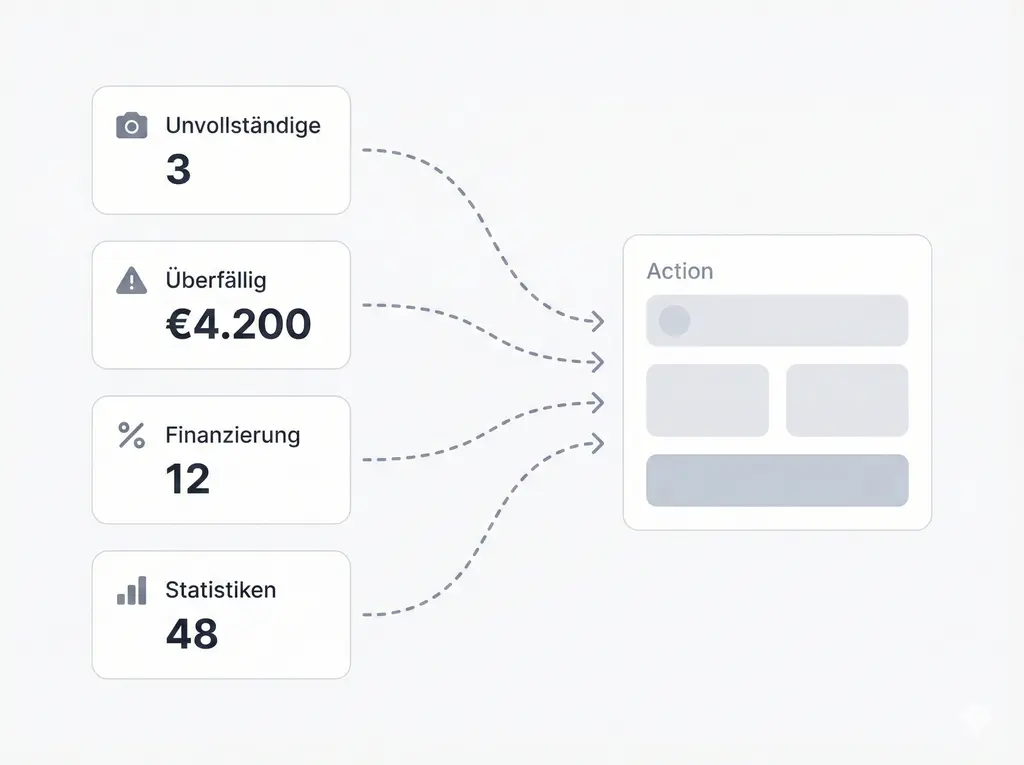 Das ist kein statischer Bericht. Klicken Sie auf ein Fahrzeug ohne Bilder und Sie sind im Editor. Klicken Sie auf eine überfällige Rechnung und Sie sind bei der Zahlung. Das Dashboard startet Aktionen.