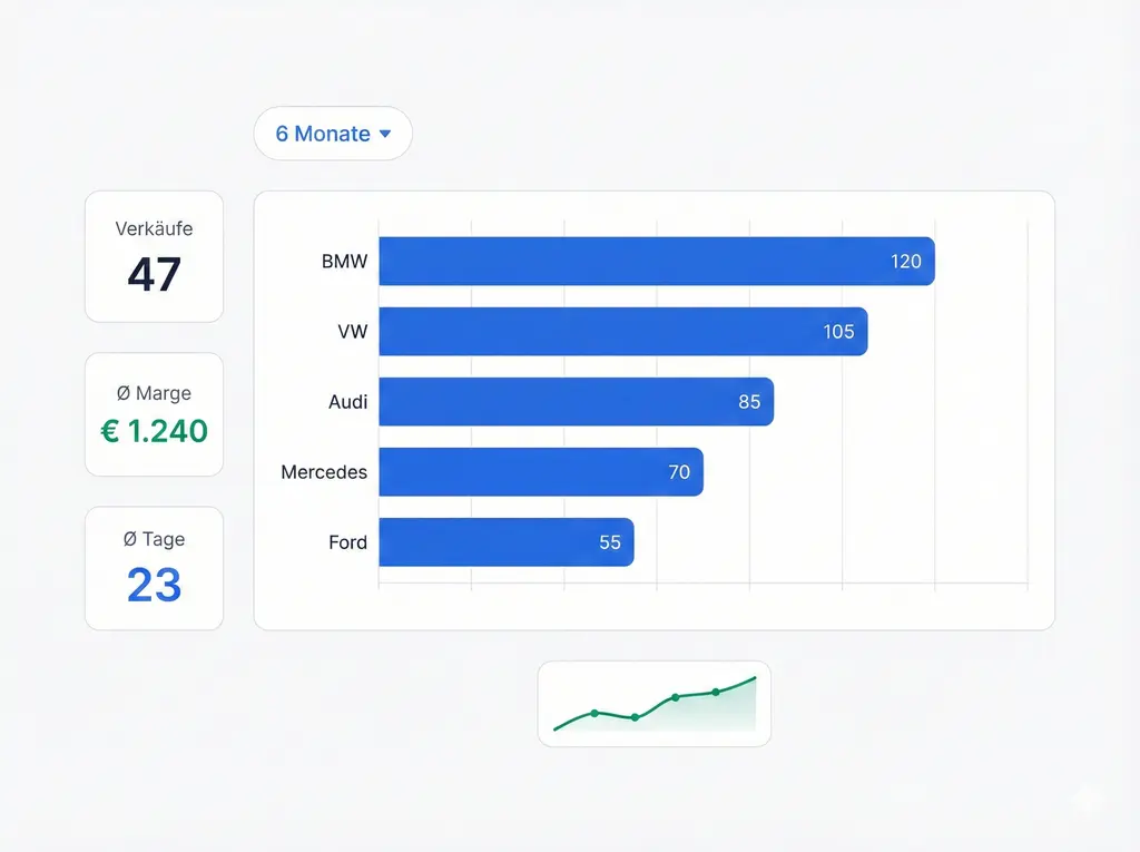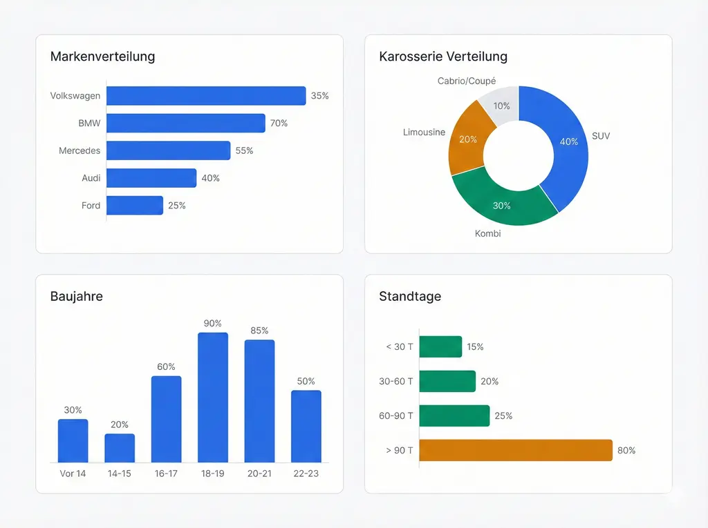 Die Bestandsstatistik visualisiert Ihren aktuellen Bestand. Verteilung nach Marke, Karosserie, Kraftstoff, Alter und Standtagen. Ungleichgewichte erkennen, bevor sie zum Problem werden.