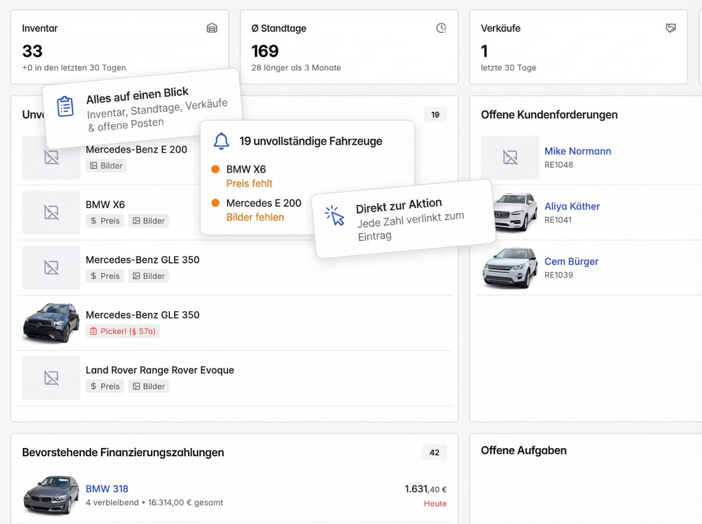 Der Übersicht-Tab ist Ihre tägliche Kommandozentrale. Unbezahlte Rechnungen, anstehende Finanzierungsraten, Fahrzeuge ohne Fotos oder Inserate, alles, was Handlung erfordert, automatisch sichtbar.
